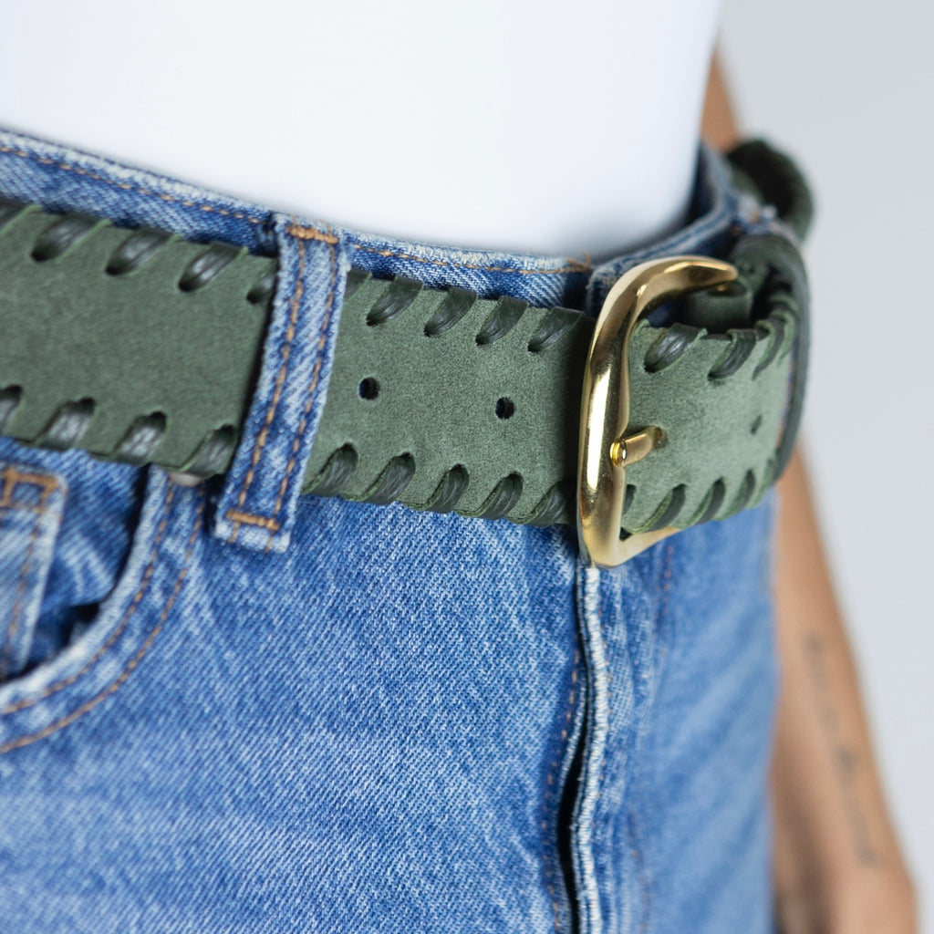 - Colore e composizione: camoscio verde bosco e intreccio in pelle verde bosco
