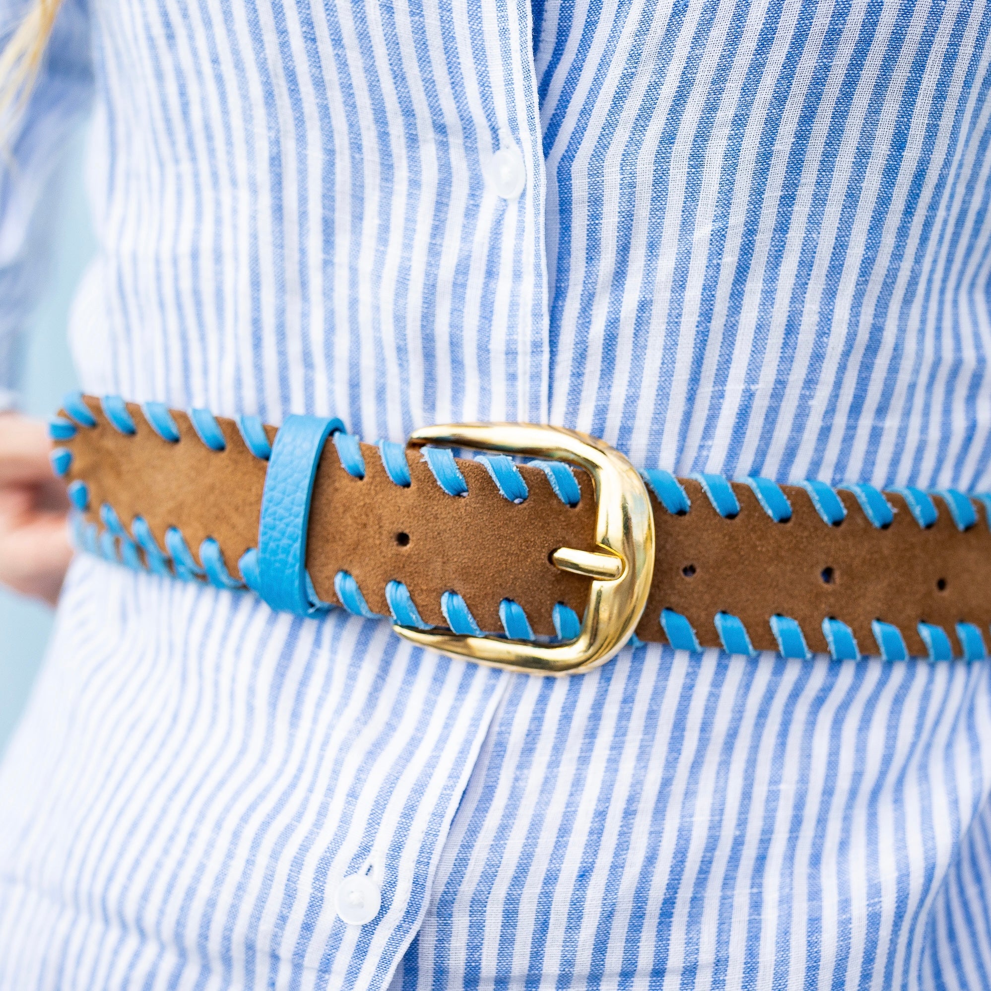 • Colore e composizione: camoscio color cuoio e intreccio in pelle turchese