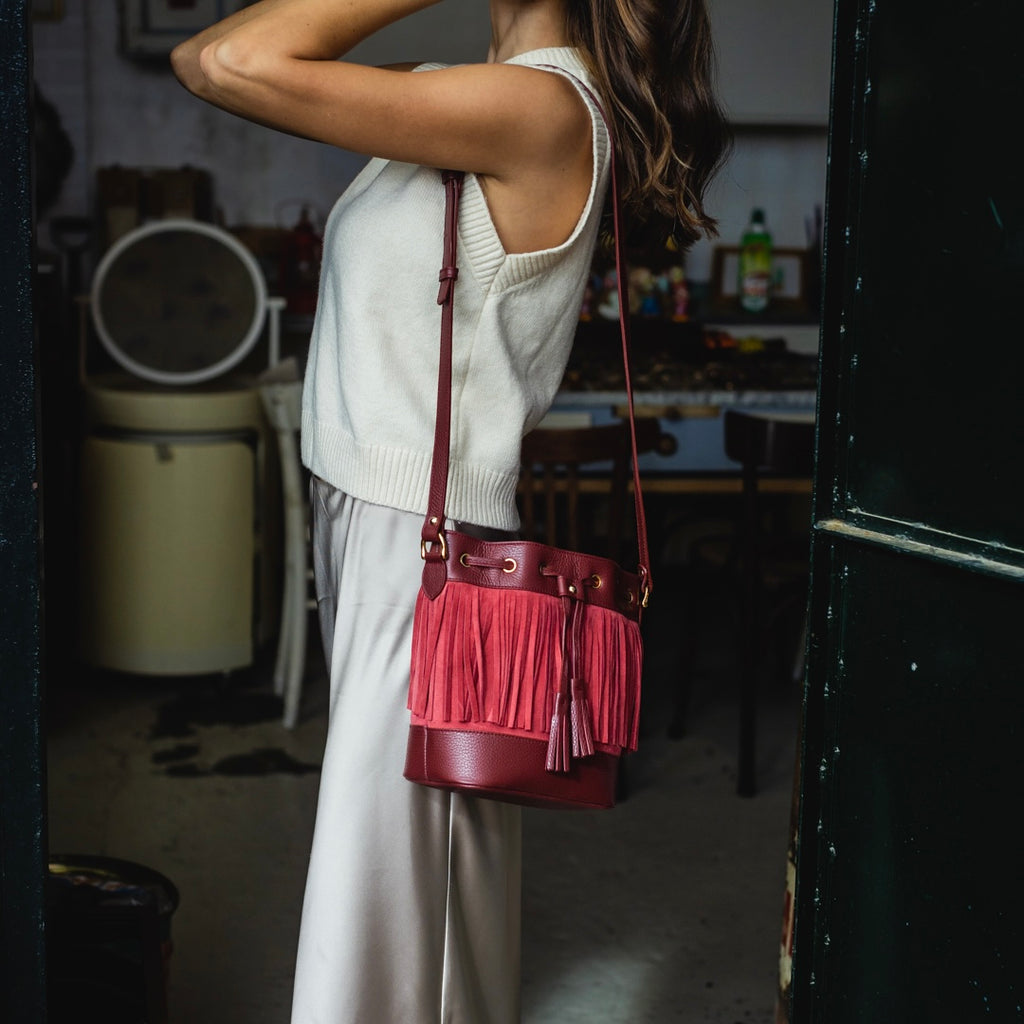 - Colore e composizione: pelle liscia bodeaux e suede rosso ciliegia a frange