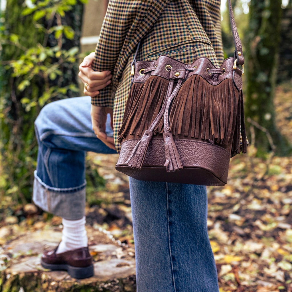 • Colore e composizione: pelle liscia cuoio e suede testa di moro a frange