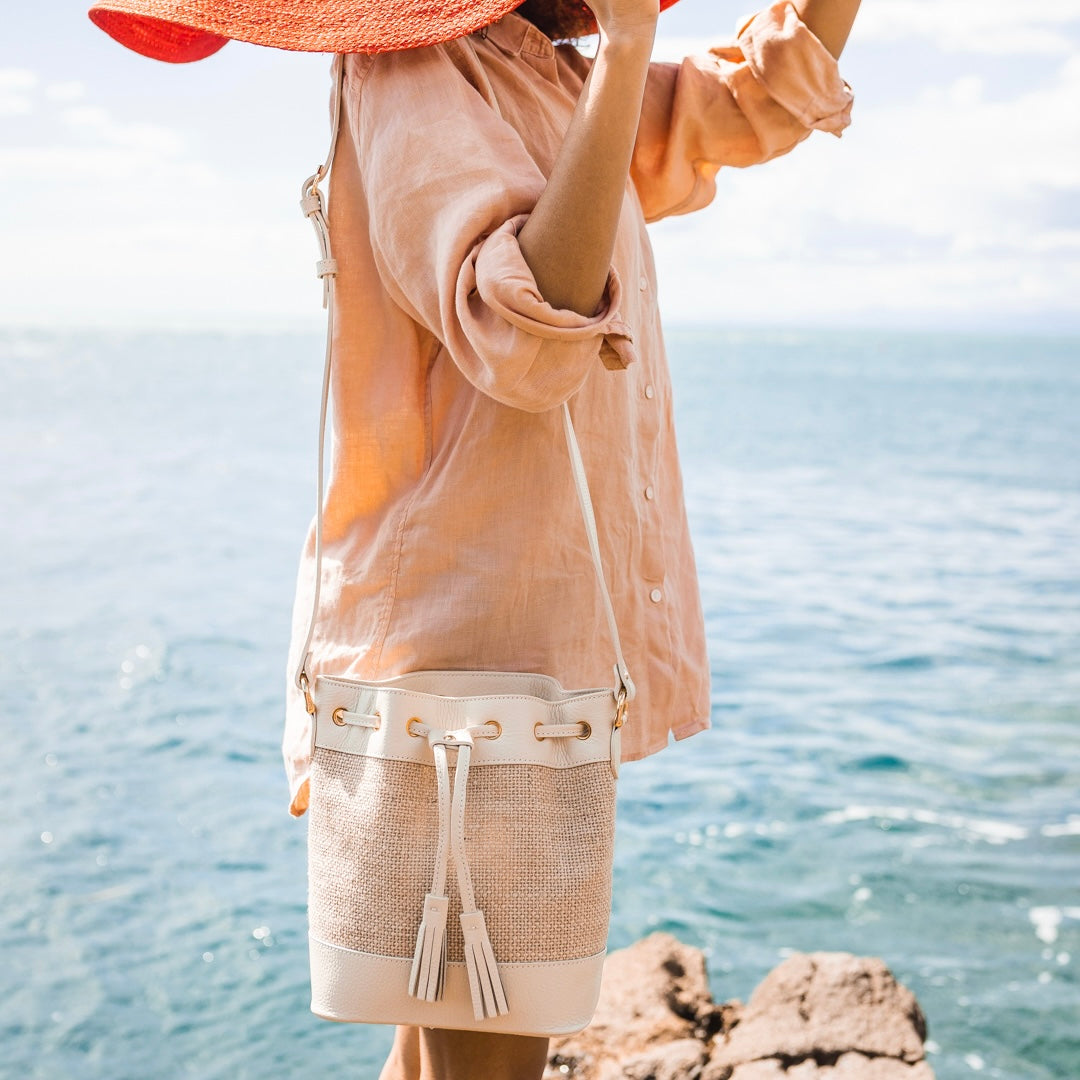 • Colore e composizione: pelle martellata bianca panna e iuta
