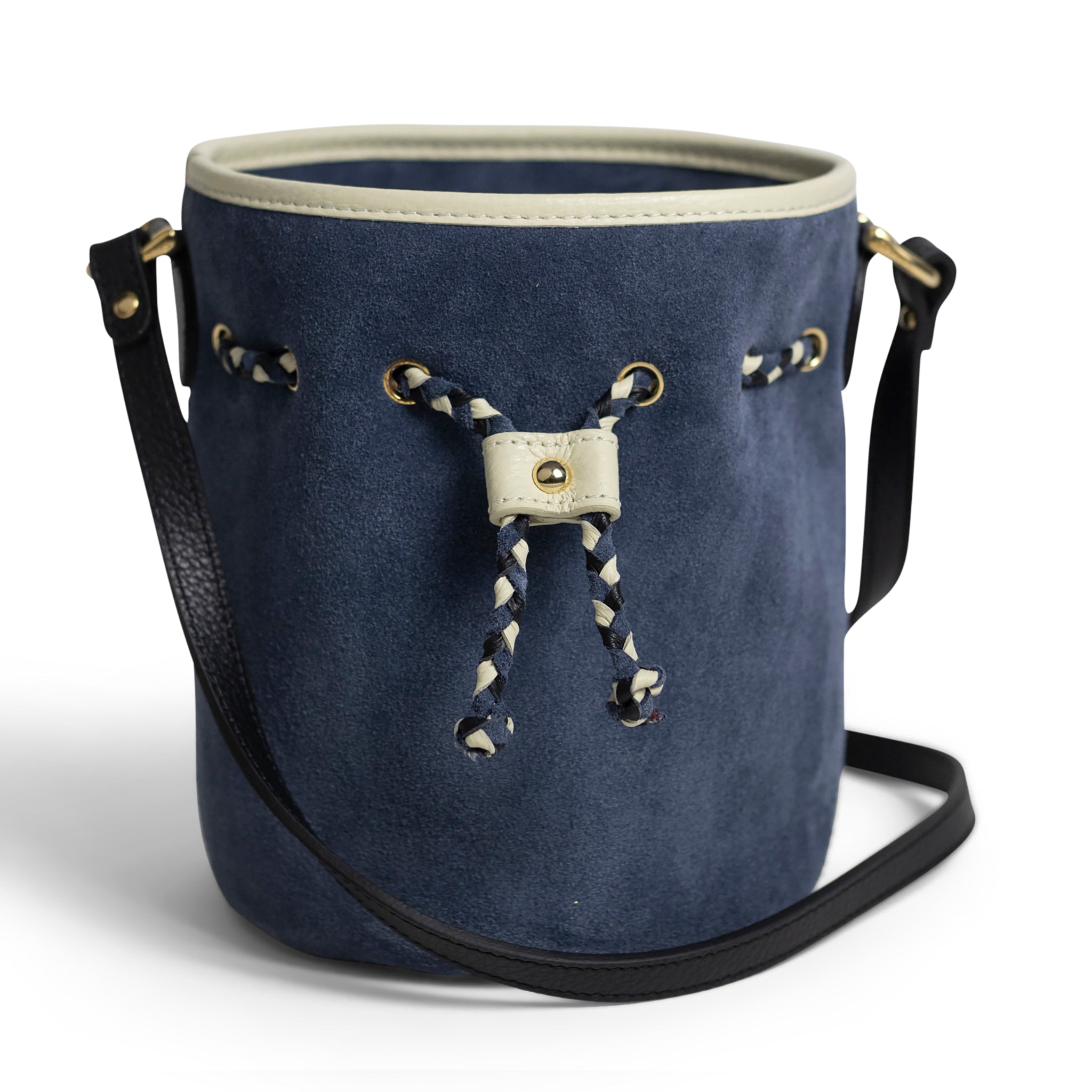 - Colore e composizione: camoscio blu con dettagli in pelle nera e pelle panna