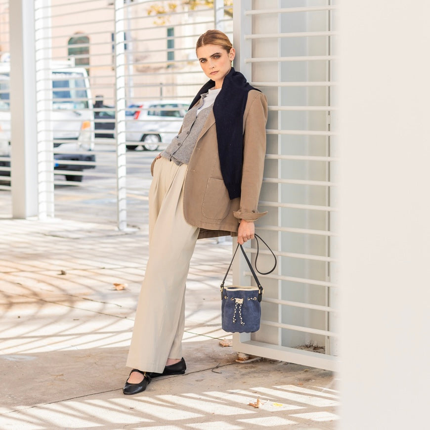 • Colore e composizione: camoscio blu con dettagli in pelle nera e pelle panna