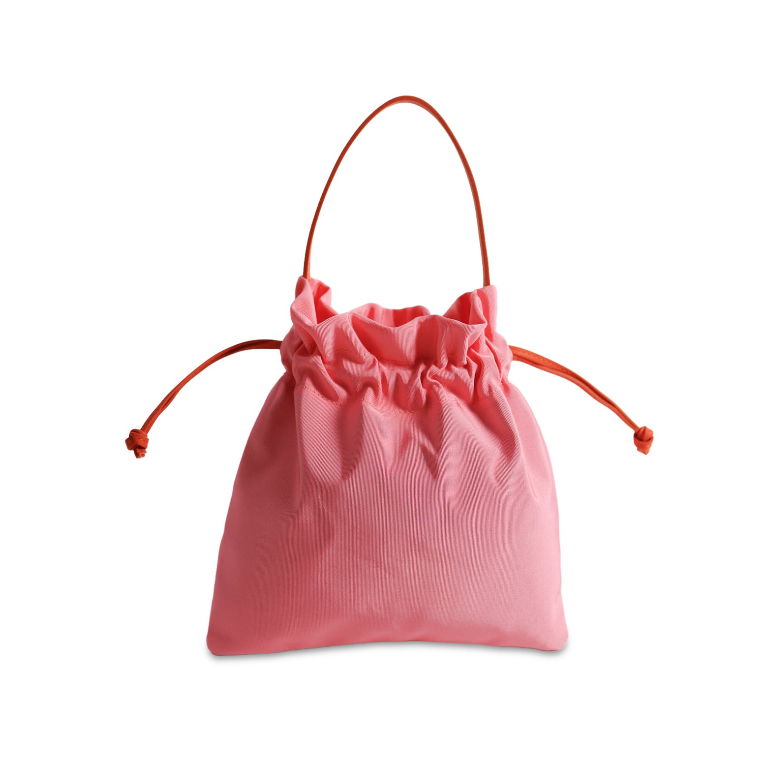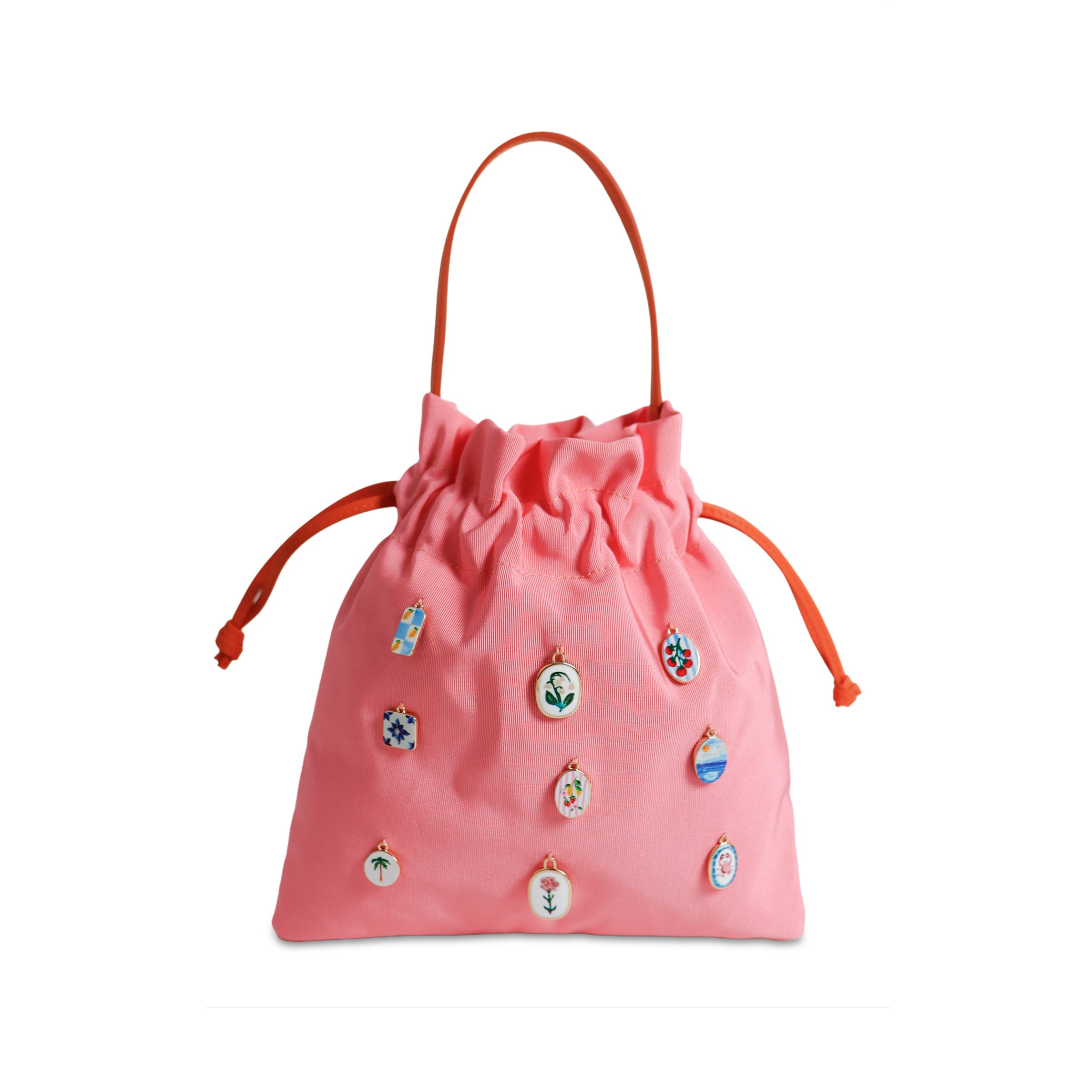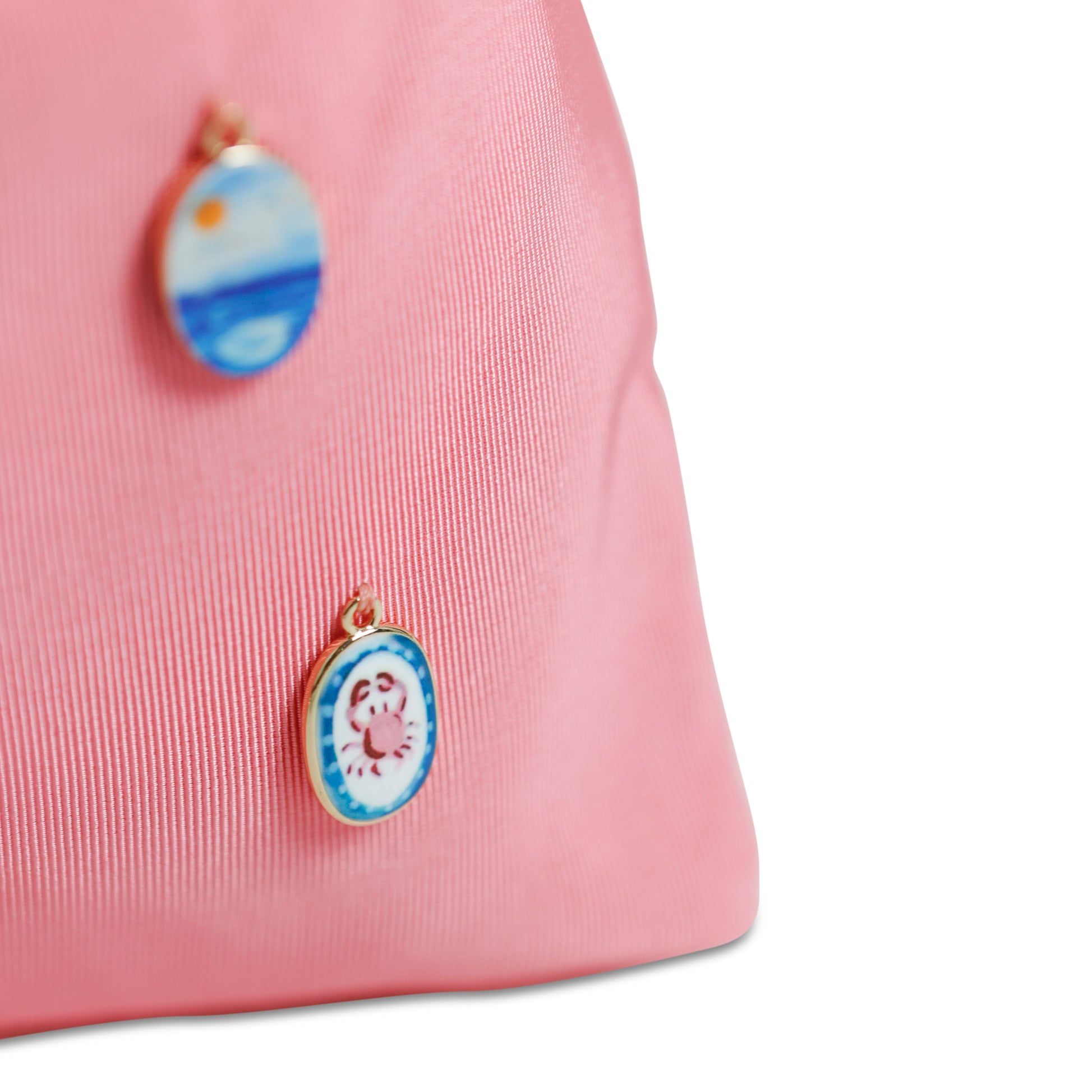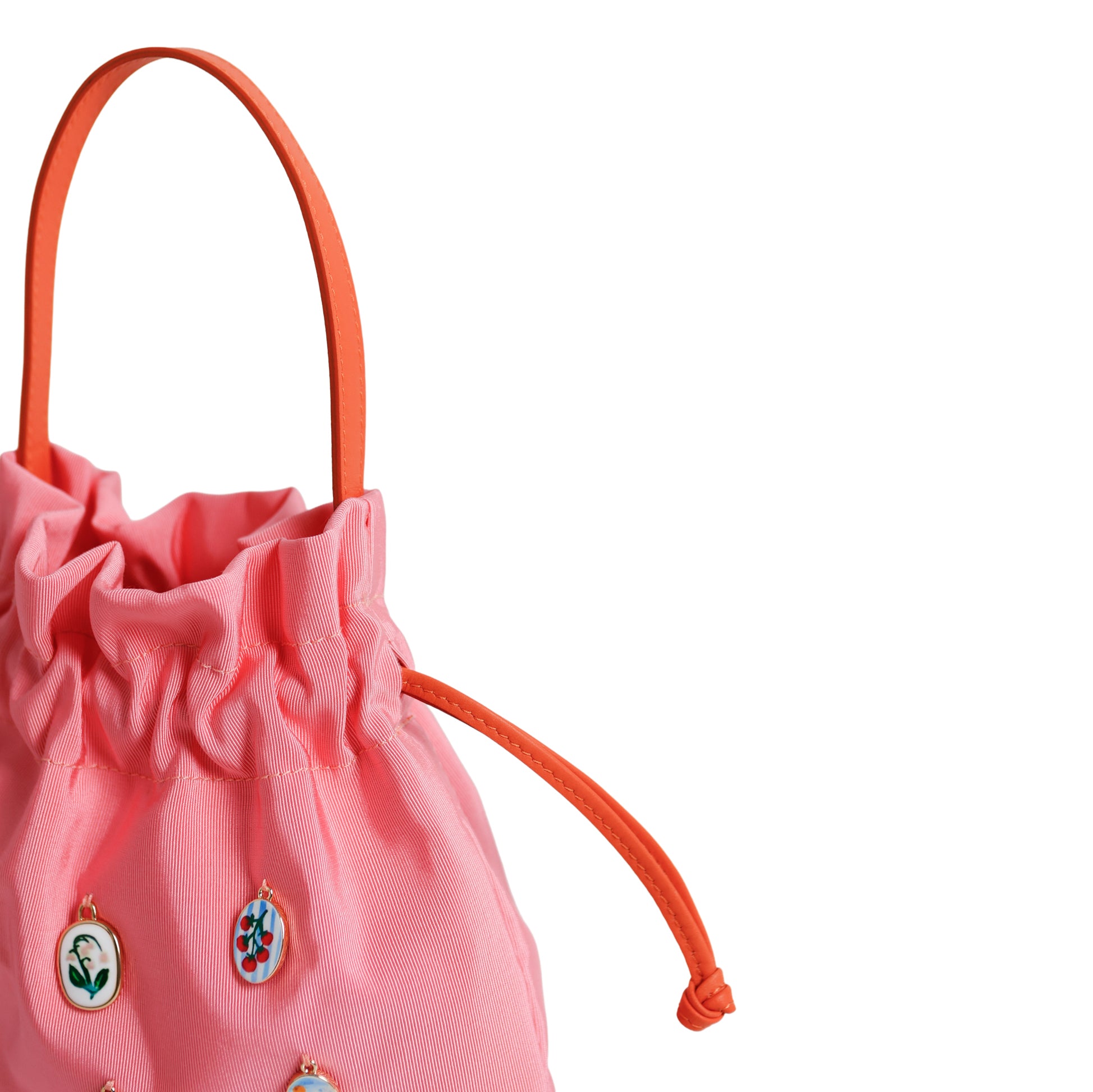 Mini borsa a sacchetto gros grain rosa con manico e coulisse in pelle arancio. Ciondoli dipinti e smaltati cuciti a mano.