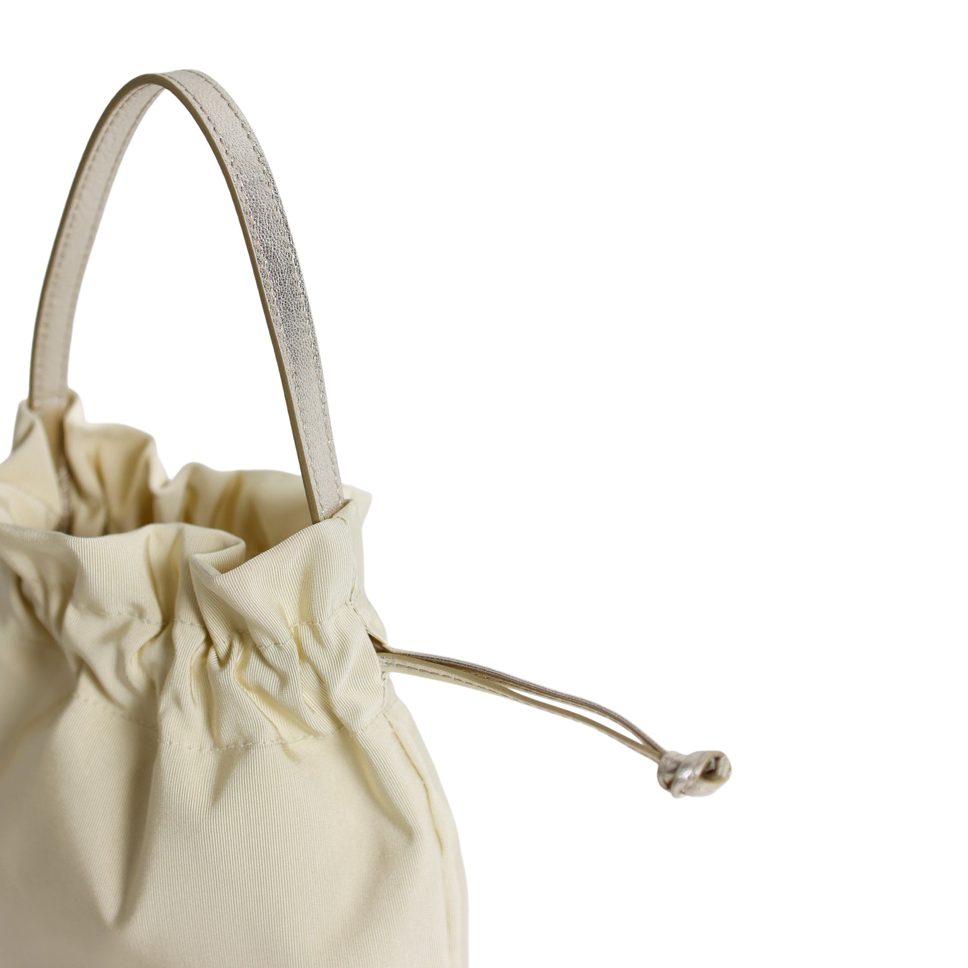 Mini borsa a sacchetto in gros grain champagne con manico e coulisse in pelle dorata.