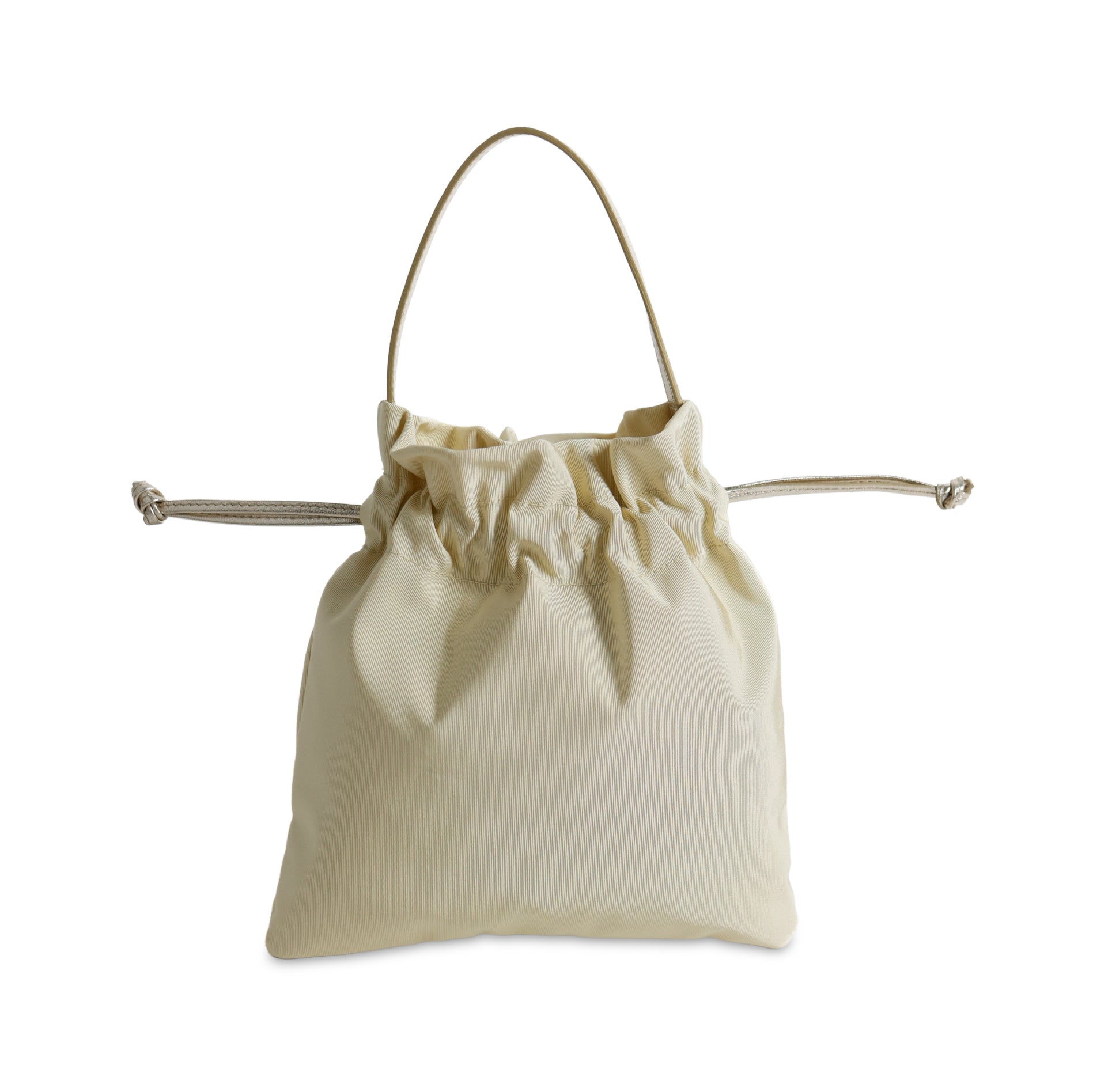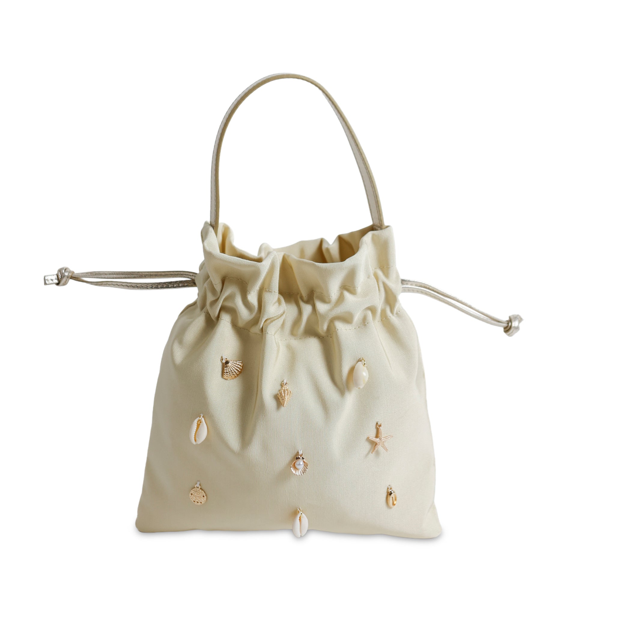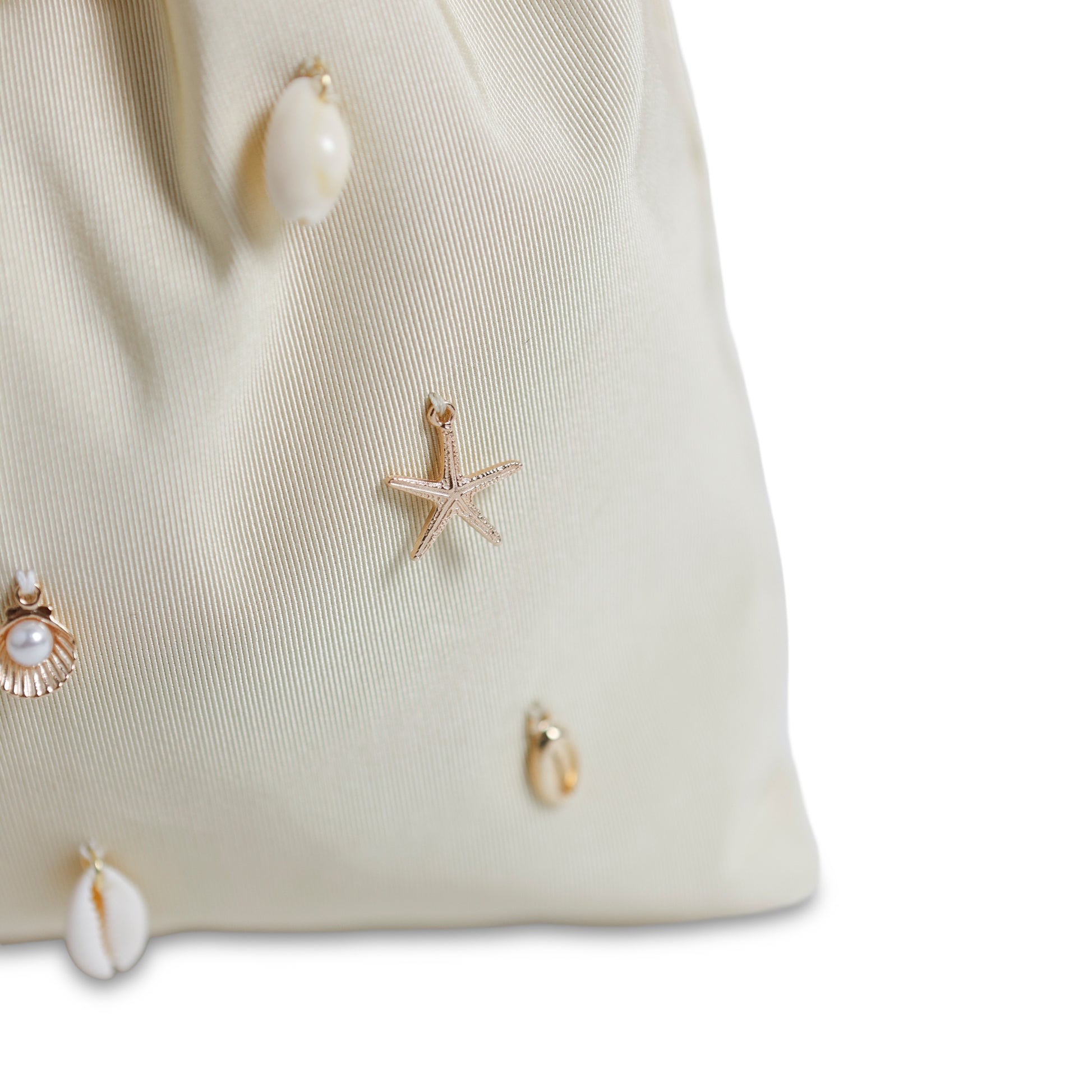 Mini borsa a sacchetto gros grain champagne con manico e coulisse in pelle dorata. Conchiglie e ciondoli dorati cuciti a mano.