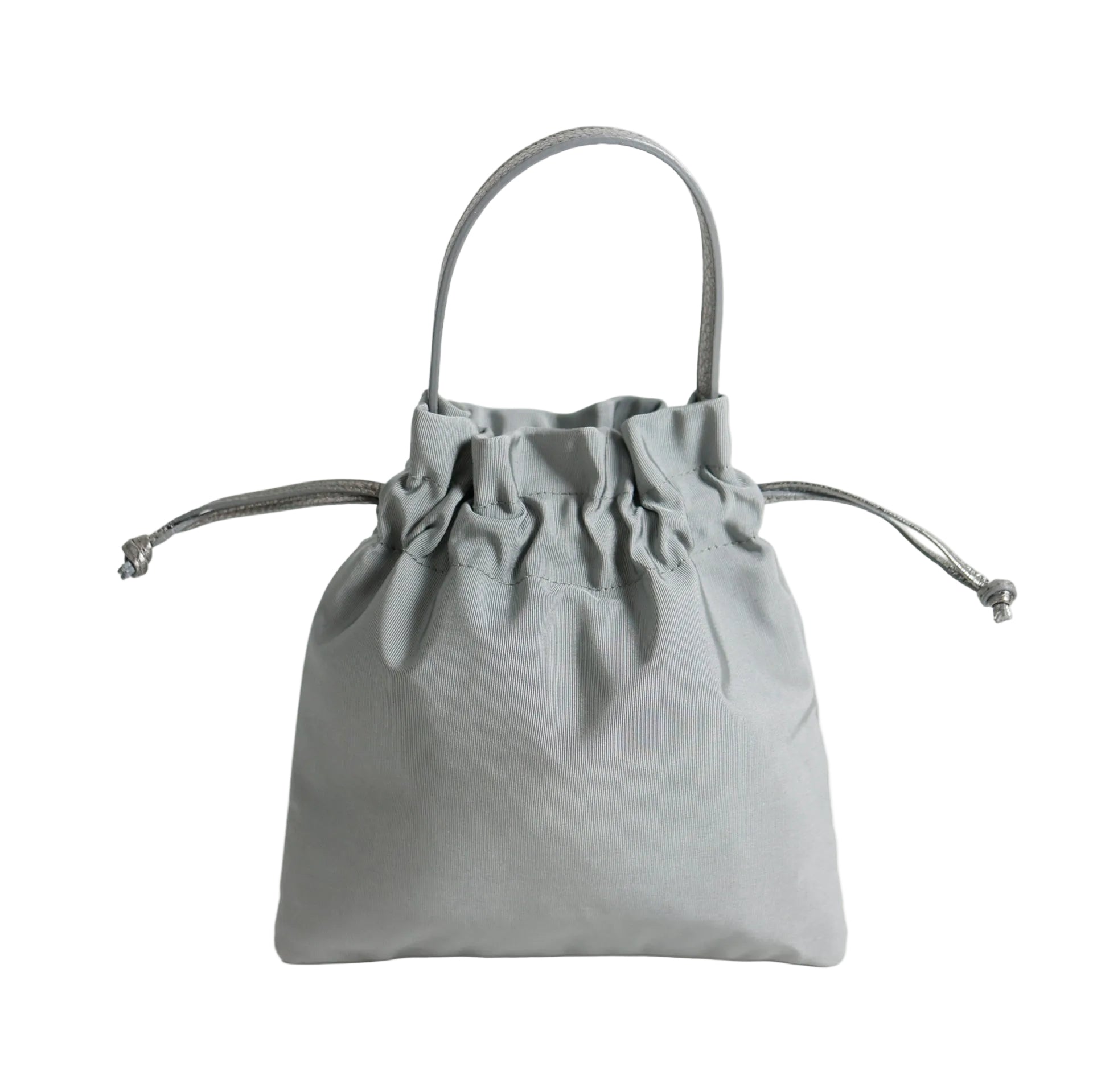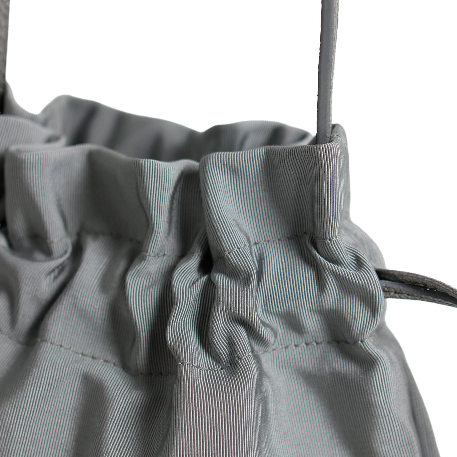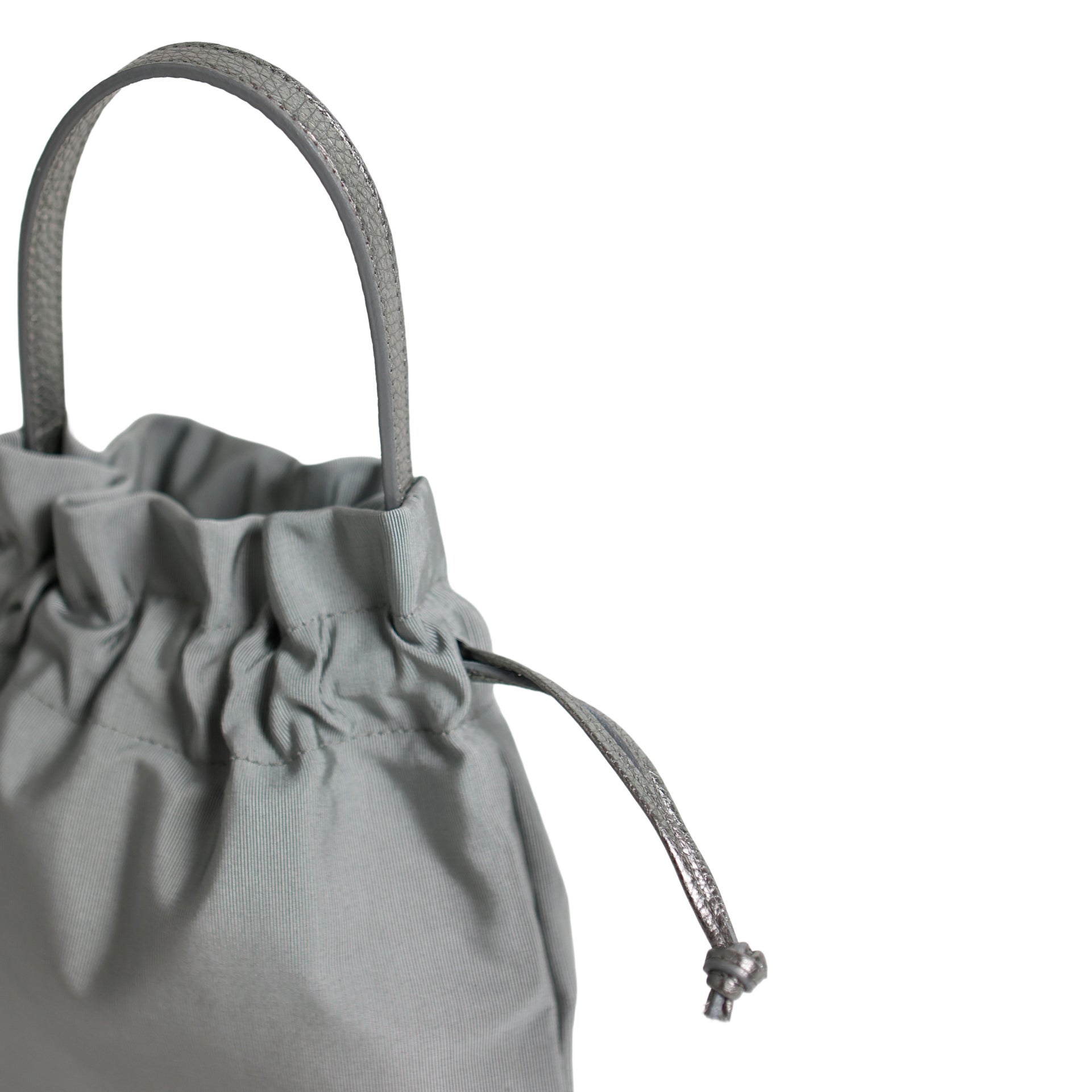 Mini borsa a sacchetto in gros grain grigio/argento con manico e coulisse in pelle argentata.